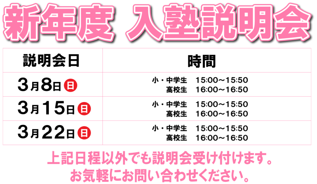 ③入塾説明会に生徒様、ご父兄様が一緒にご参加ください。詳しい説明後、ご質問をお受けします。それらが終わったのち、体験授業日を決めます。