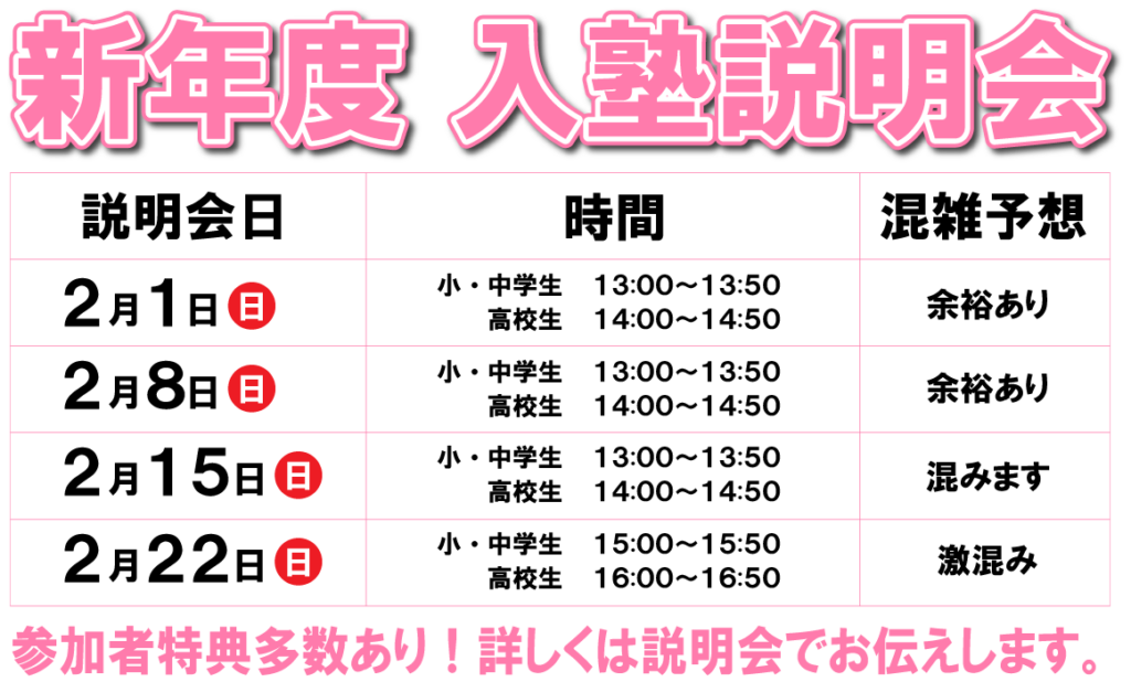 ③入塾説明会に生徒様、ご父兄様が一緒にご参加ください。詳しい説明後、ご質問をお受けします。それらが終わったのち、体験授業日を決めます。